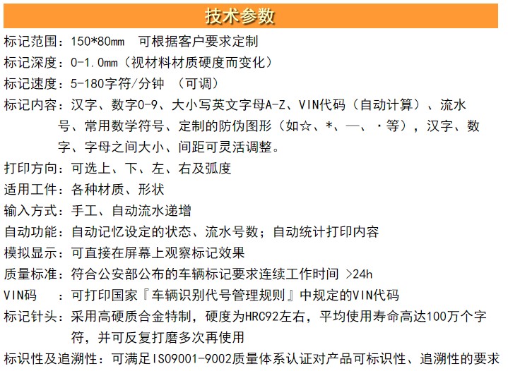 适用于整车生产厂家(如挂车、拖车、卡车、改装车、专用车、客车等)车架、VIN码及名牌号、大型工件或不恩能够移动的工件上打标,电磁铁吸附,可实现在户外移动打标。同时适用于返修及改号机型打印。